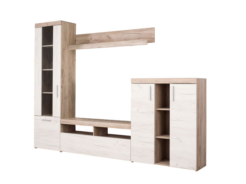 Стенка для гостиной ARNO в комбинации декора под цвет серого и белого дуба характеризуется дизайном с чистыми линиями и богатой текстурой, а также гармоничной комбинацией элементов с полуоткрытымы, застеклёнными и открытыми вариантами. Благодаря современной функциональности полезной зоны и тёплой колоритной схеме данная модель стенки создаст идеальную гостиную, заполненную любимыми сувенирами, книгами и декорами.