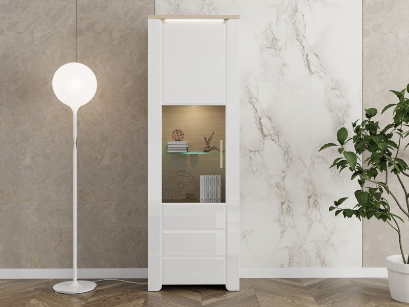 Сервант ABERDEEN 1K VS1 194, выполненная в сочетании матового белого декора, светлого портового дуба и белой лаковой фольги, привносит в пространство элегантность, минимализм и безупречный стиль. Полезное пространство включает один закрытый полузастеклённый сегмент, внутри которого расположены практичные полки для упорядоченного хранения различных предметов повседневного использования и декоративных элементов. Двери дополнены сдержанными ручками, которые подчёркивают дизайнерскую линию всей коллекции. Сервант ABERDEEN 1K VS1 194 является частью системы элементов ABERDEEN, отличающейся современным внешним видом и функциональностью.