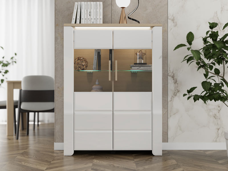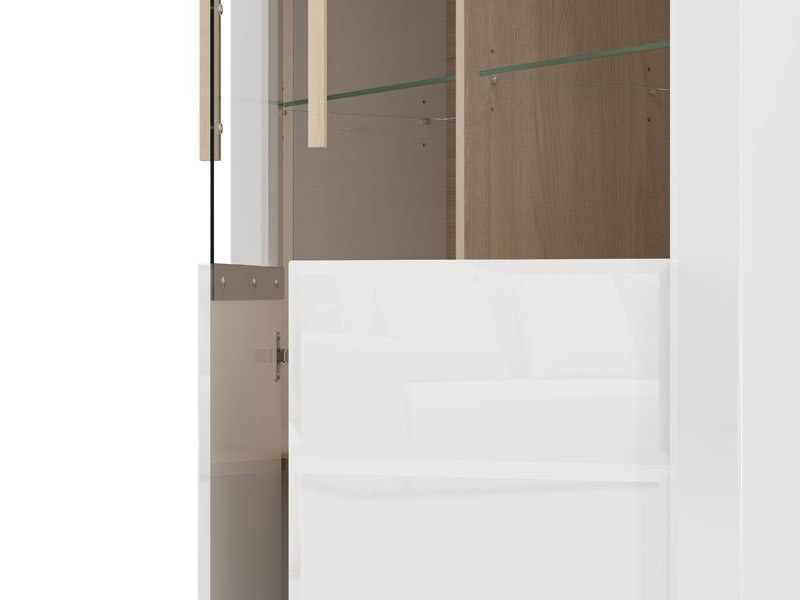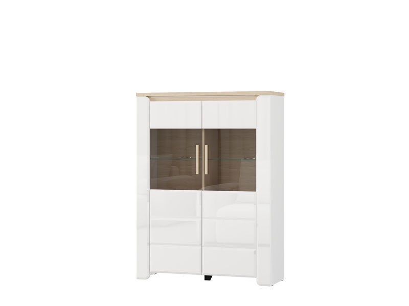 Сервант ABERDEEN 2K VS2 129, выполненная в сочетании матового белого декора, светлого портового дуба и белой лаковой фольги, привносит в пространство элегантность, минимализм и безупречный стиль. Полезное пространство включает два закрытых полузастеклённых сегмента, внутри которых расположены практичные полки для упорядоченного хранения различных предметов повседневного использования и декоративных элементов. Двери дополнены сдержанными ручками, которые подчёркивают дизайнерскую линию всей коллекции. Сервант ABERDEEN 2K VS2 129 является частью системы элементов ABERDEEN, отличающейся современным внешним видом и функциональностью. Предусмотрена возможность установки дополнительной LED-подсветки, что позволяет визуально акцентировать пространство и обеспечить дополнительное освещение.