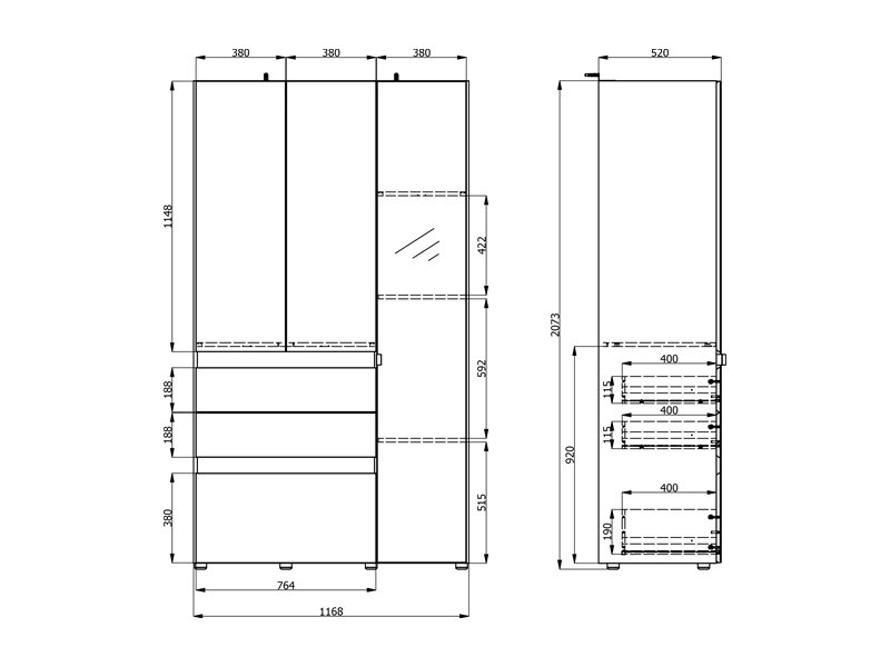 Шкаф ARDERIN 3K3F1O h207, выполненный в комбинации декора ремесленного дуба и графитово-серого декора, представляет собой элегантное и современное решение для хранения одежды. Полезное пространство включает двустворчатую часть с гардеробной штангой, под которой расположены три ящика - два более мелких и один глубокий, а также секцию с перегородками, расположенную за дверью с зеркалом, что обеспечивает наглядную и практичную организацию одежды и аксессуаров. Существует возможность добавления комплекта полок для дополнительной функциональности внутреннего пространства.