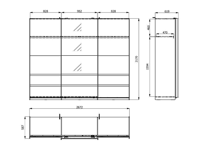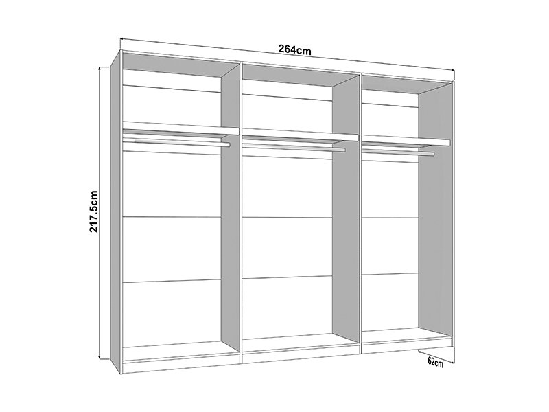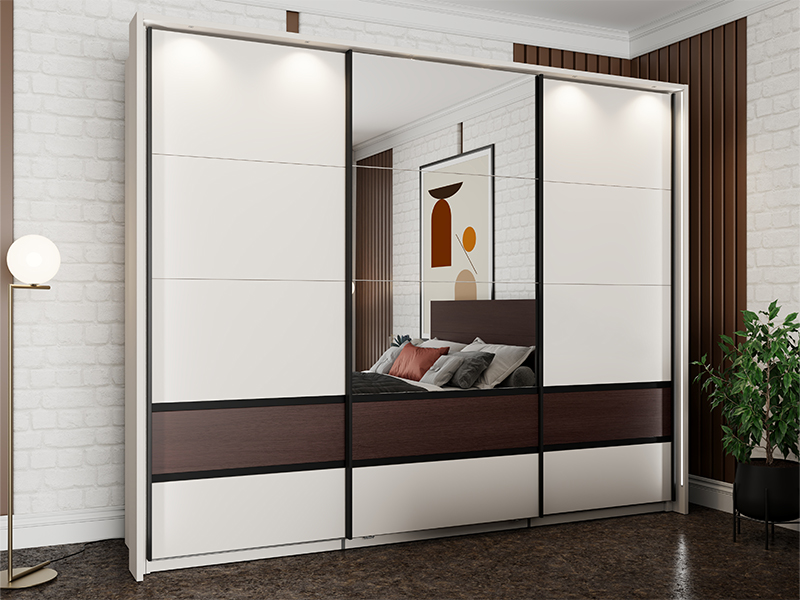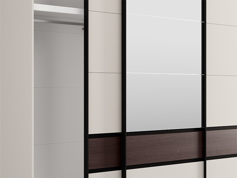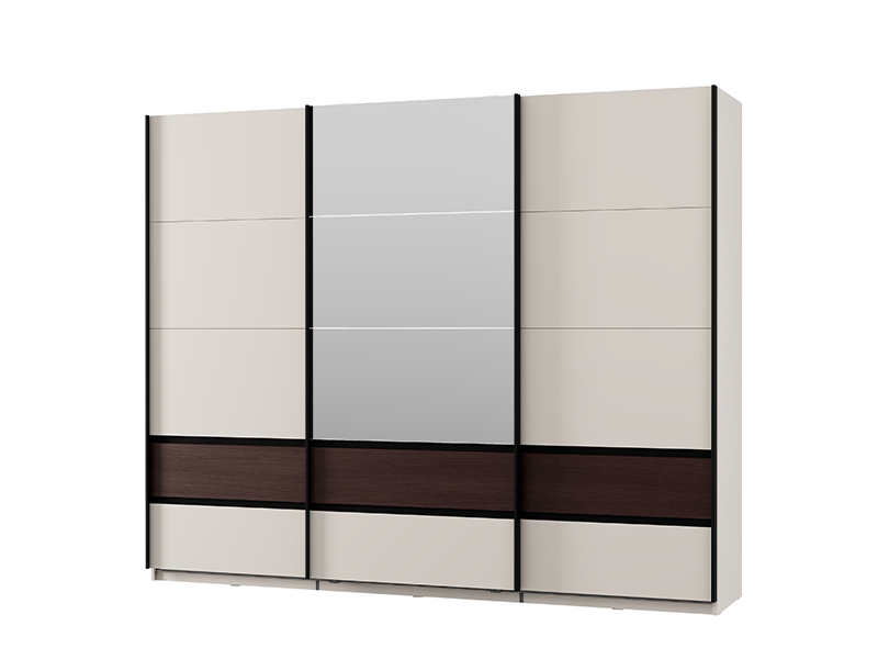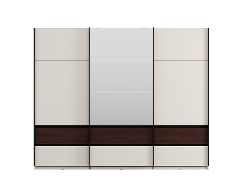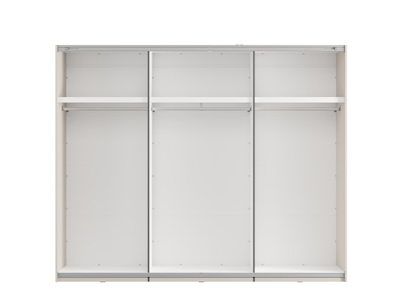 Данная модель оснащена трёхстворчатой раздвижной системой дверей, при этом центральная дверь оборудована зеркалом, что повышает функциональность и визуально расширяет пространство. В базовой комплектации функциональное пространство шкафа включает три штанги для одежды, обеспечивающие наглядное и практичное хранение гардероба.