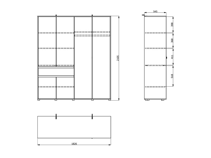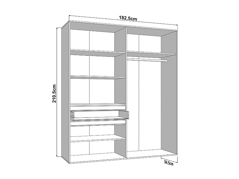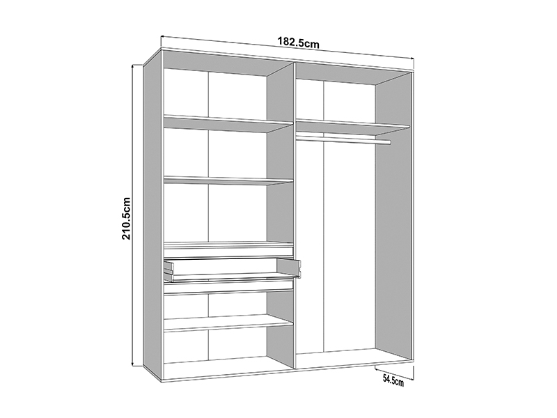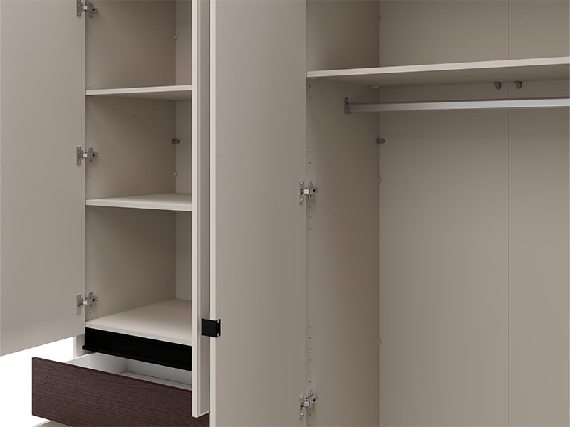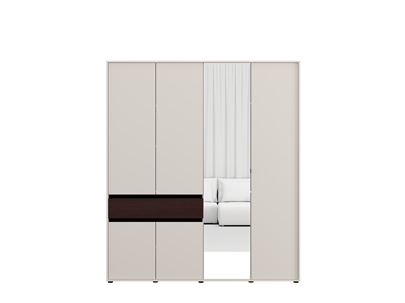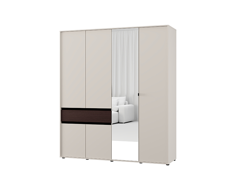Данный четырёхстворчатый шкаф оснащён секцией с штангой для одежды, закрытым перегородочным отсеком и одним выдвижным ящиком, при этом одна дверь оборудована зеркалом, что дополнительно повышает функциональность и визуально расширяет пространство.