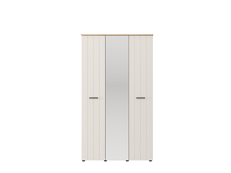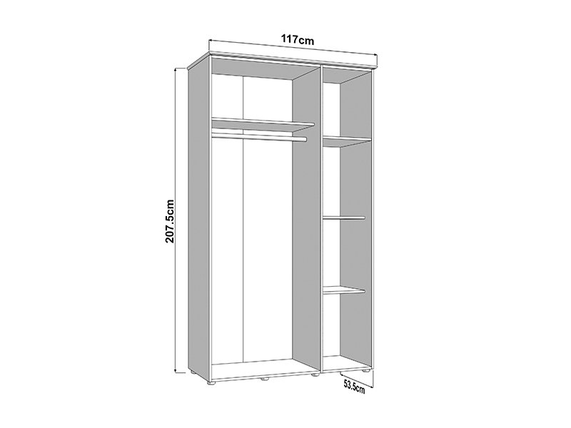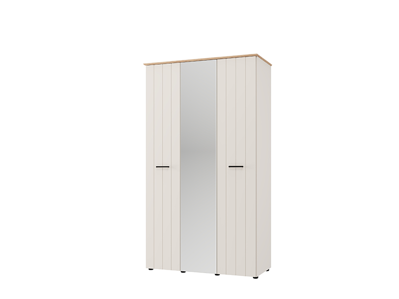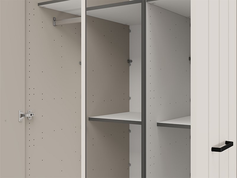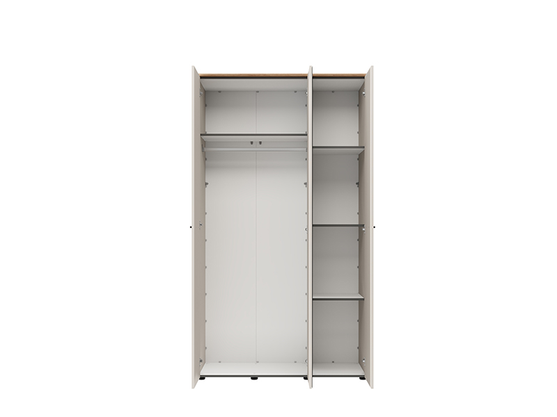Трёхстворчтый шкаф организован таким образом, что двустворчатая секция оснащена штангой для одежды, а одностворчатая секция предоставляет дополнительное пространство для наглядного и удобного хранения вещей. Шкаф также предусматривает возможность последующего добавления комплекта полок, что дополнительно повышает функциональность внутреннего пространства.
