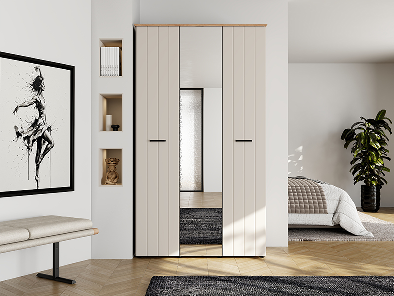 Шкаф LAMBETH 3K1O h217, выполненный в сочетании кашемира и декора ремесленного дуба, придаёт спальне тёплый и рустикальный облик, подчёркивая чётко выраженную геометрическую линию дизайна и тиснёные полосы на дверях.