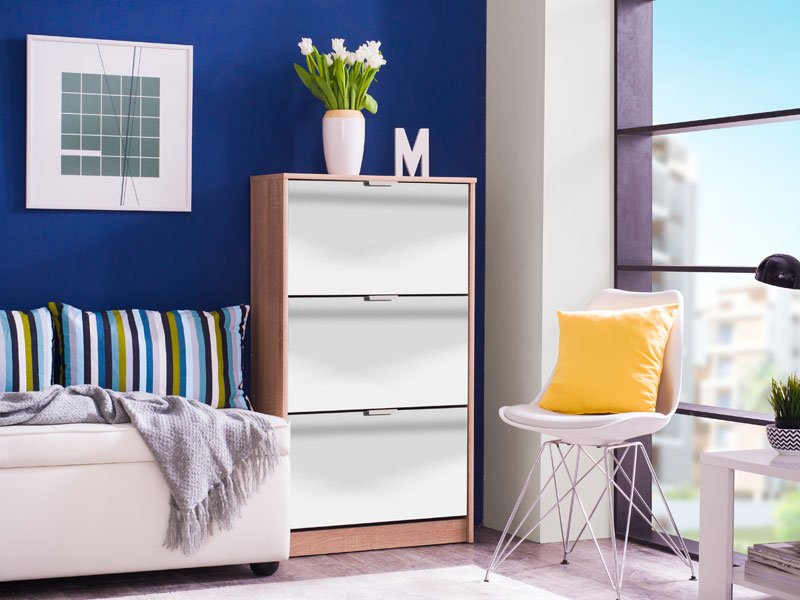 Шкаф для обуви HUGO 23 OG в сочетании зеркала с корпусом в декоре под цвет сонома дуба имеет три сегмента для откладывания сезонной обуви, а благодаря своим размерам и двухуровневой планировки представляет собой очень эффективное функциональное решение дизайна прихожей более скромных размеров.
