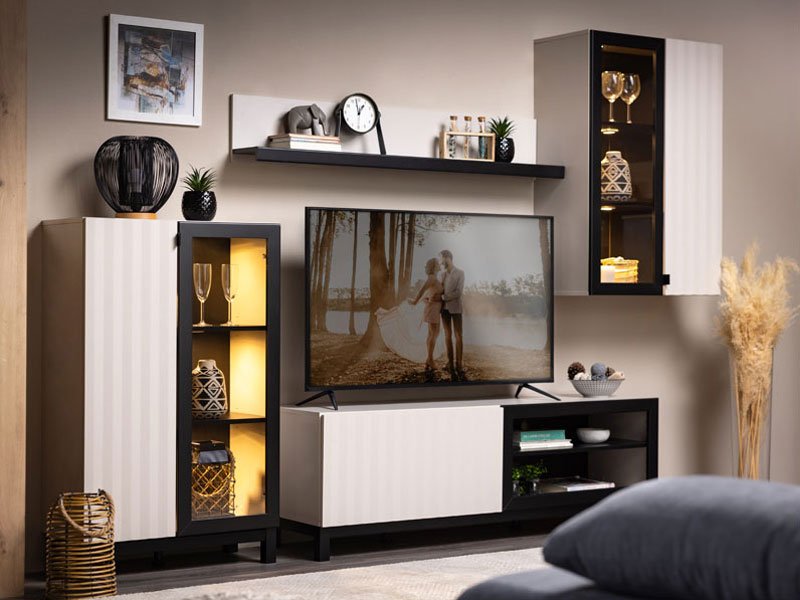 Стенка MACON в сочетании кашемирового декора, кашемировой пленки, черной и черной матовой пленки разработана с учетом функциональных и эстетических требований меблировки гостиной. Стенка MACON позволяет практично обставить гостиную благодаря полезному пространству, состоящему из открытых и закрытых полок для хранения вещей, одной застекленной части с полками для особых ценностей, а также места для телевизора и другого аудиовизуального оборудования. Имеется возможность добавления освещения.