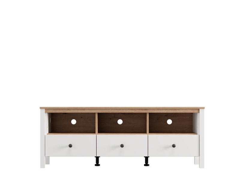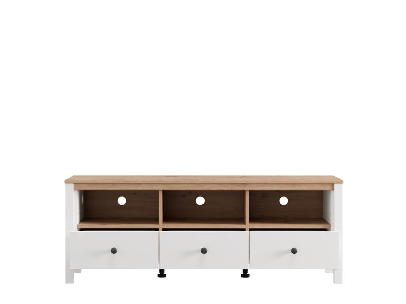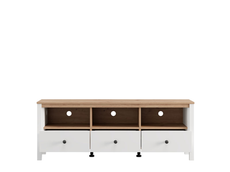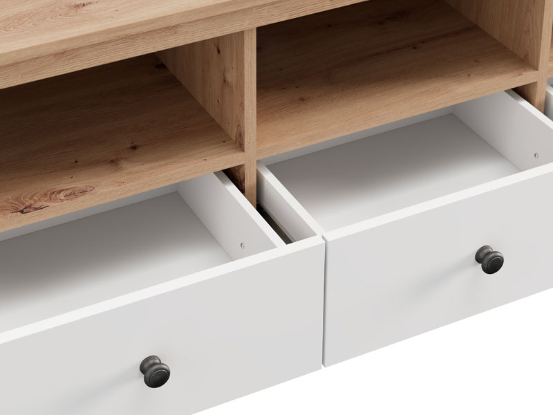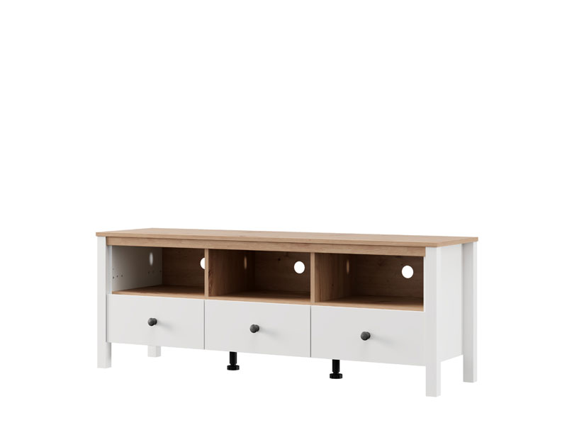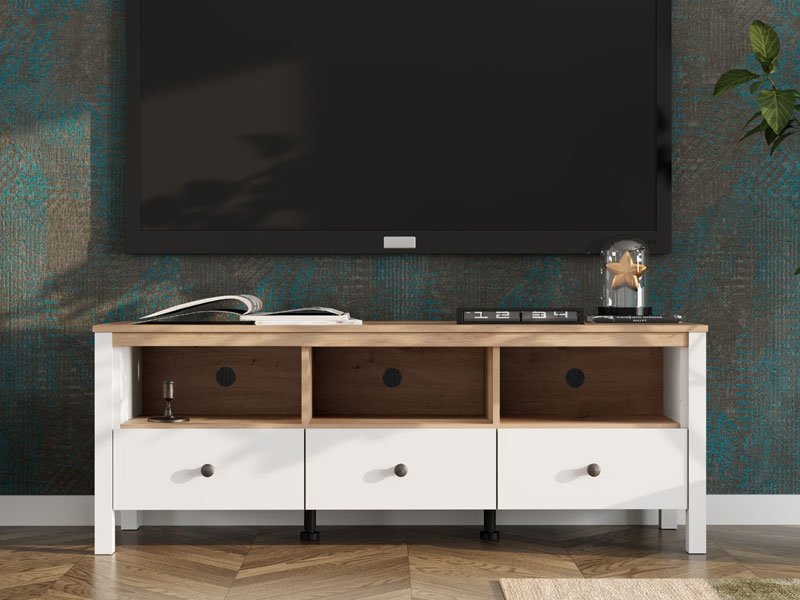 Тумба для ТВ BEDFORD TV 143 3K3F, выполненная в сочетании матового белого декора, декора ремесленного дуба, белой матовой фольги и фольги ремесленного дуба, привносит в пространство тепло, элегантность и природное очарование. Полезное пространство включает три открытые секции и три вместительных ящика, что обеспечивает практичное и упорядоченное хранение медиаустройств, книг и декоративных предметов. Тумба для ТВ BEDFORD TV 143 3K3F является частью системы элементов BEDFORD, отличающейся сочетанием рустикальной эстетики и функционального современного дизайна.