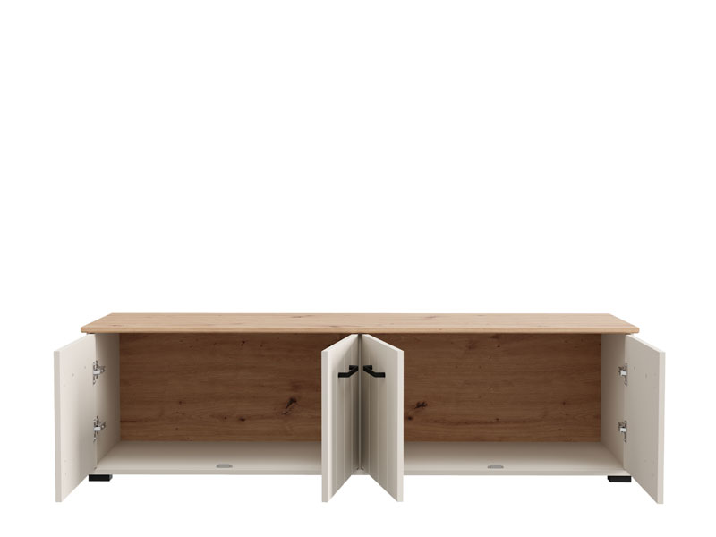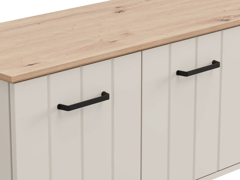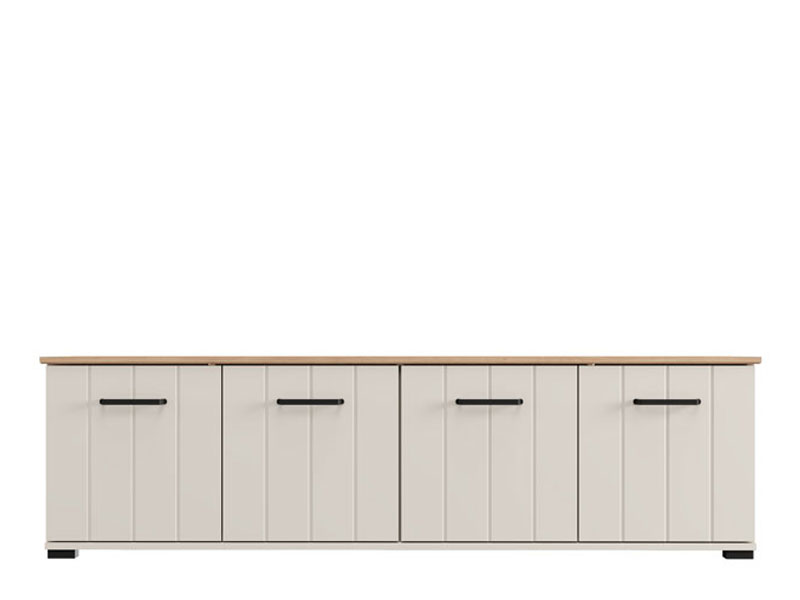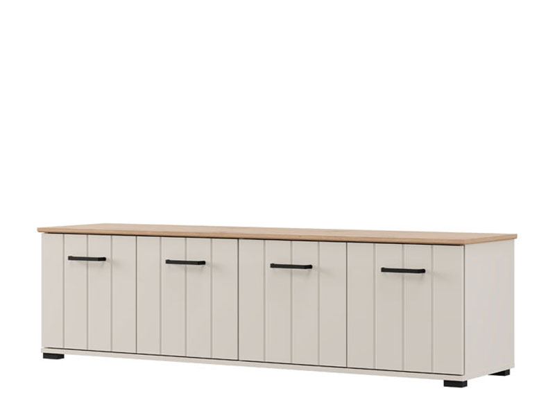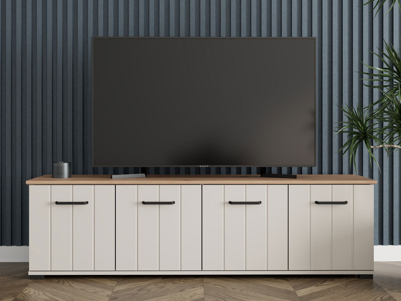 Тумба для ТВ LAMBETH TV 156 4K4V, выполненная в сочетании декора кашемира и декора ремесленного дуба, привносит в пространство тепло и рустикальный характер благодаря особой финишной обработке в виде рельефных полос, нанесённых на двери. Полезное пространство включает четыре закрытых секционных отделения, которые обеспечивают практичное и упорядоченное хранение.цТумба для ТВ LAMBETH TV 156 4K4V является частью системы элементов LAMBETH, отличающейся выразительным стилем и функциональностью.