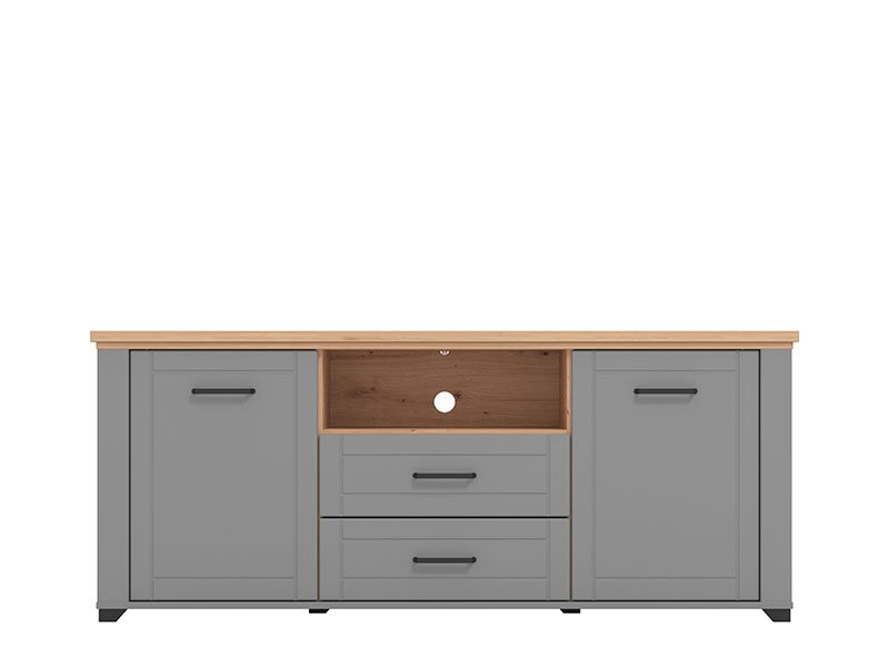 Тумба для ТВ VALENCIA TV 160 3K2F с декоративной отделкой в комбинации дуба артизан, графитового серого и серой матовой пленки привносит в интерьер тонкую, монохроматическую ноту. Полезное пространство образовано практичными выдвижными ящиками в средней части, одним открытым и двумя закрытыми отделами, внутри которых практично расположены полки для хранения вещей. Фасады дополнены черными ручками простого дизайна, гармонирующими с дизайнерской линией всей коллекции. Относится к одноименной системе элементов VALENCIA, отличающейся функциональностью и практичностью, чему способствует как большое количество элементов системы, так и отличная организация пространства для хранения вещей.