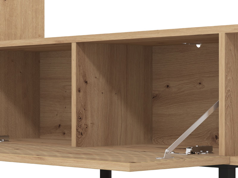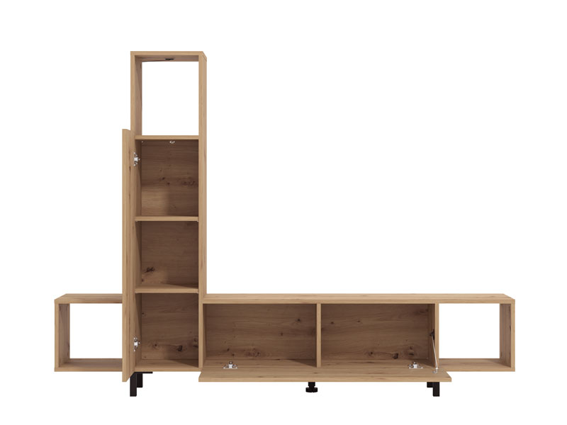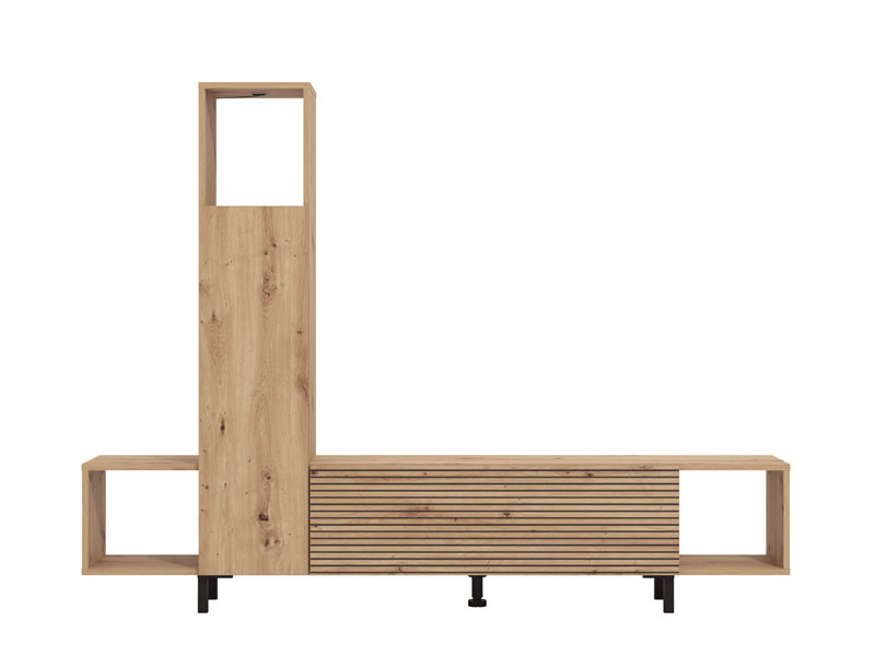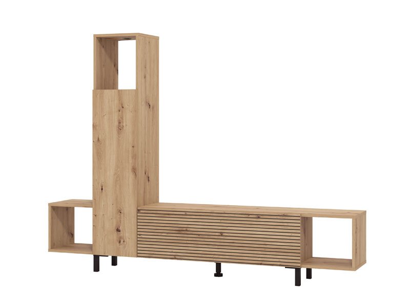 Стенка ANDROS, выполненная в комбинации декора ремесленного дуба и ремесленного дуба с полосами, представляет собой современное и функциональное решение для оформления гостиной. Благодаря компактному и сдержанному дизайну стенка ANDROS обеспечивает практичное обустройство пространства за счёт открытых и закрытых полок для хранения, а также поверхности, предназначенной для телевизора с диагональю до 50". Благодаря продуманной организации полезного пространства стенка легко вписывается в современные интерьеры дома.