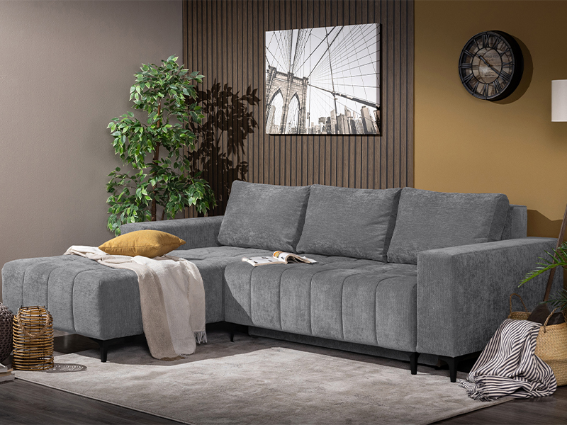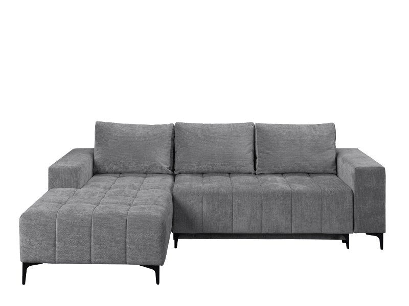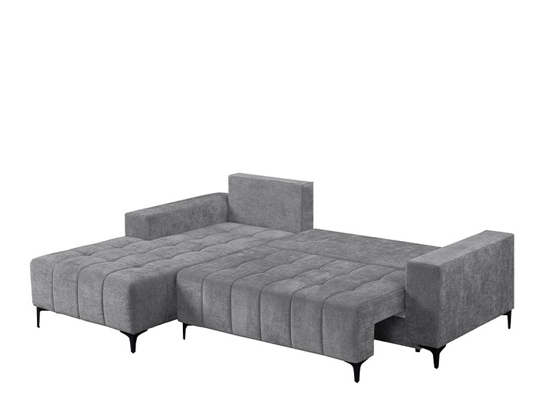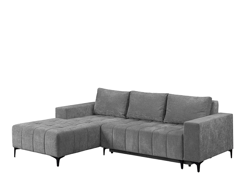 Точное наименование узора: Ткань VIBE 95 серый, левый угол. Угловой диван - кровать BOGOTA отличается современным и элегантным дизайном, идеально подходящим для современно оформленного жилого пространства. Благодаря практичному механизму опускания спинки он легко трансформируется в диван со спальной поверхностью размером 134×200 цм. Изготовлен из пенополиуретана, обеспечивая хороший уровень комфорта в повседневном использовании. Гарнитур оснащён одним ящиком для хранения, подходящим для хранения постельного белья или других необходимых вещей.