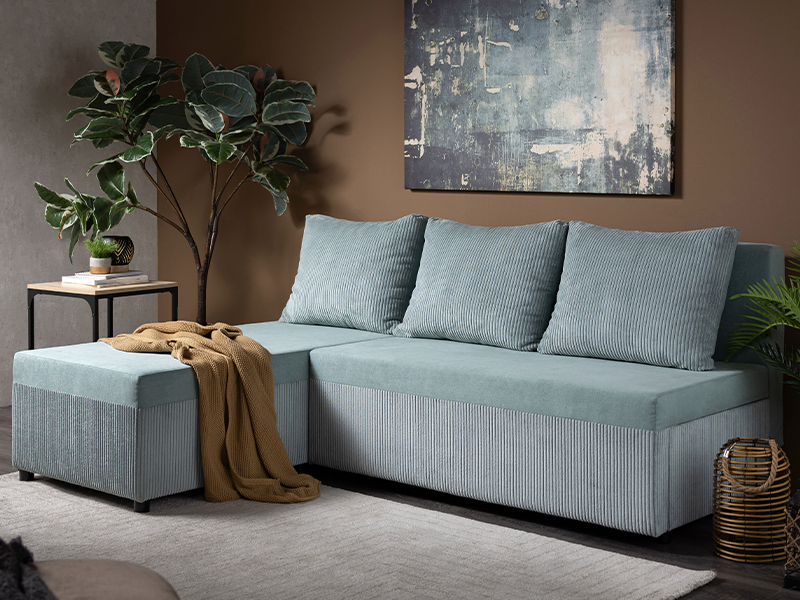Точное наименование узора: сиденье/спинка - ткань SORO 34 светло-зелёный / ткань LINCOLN 72 светло-зелёный, универсальный угол. Угловой диван - кровать LUELLA сочетает современный дизайн и практичность, идеально подходя для небольших гостиных. Благодаря практичному механизму опускания спинки он легко трансформируется в диван со спальной поверхностью размером 115×200 цм. Изготовлен из пенополиуретана, обеспечивая хороший уровень комфорта в повседневном использовании. Гарнитур оснащён одним ящиком для хранения, удобным для хранения постельного белья и других вещей.