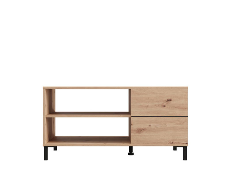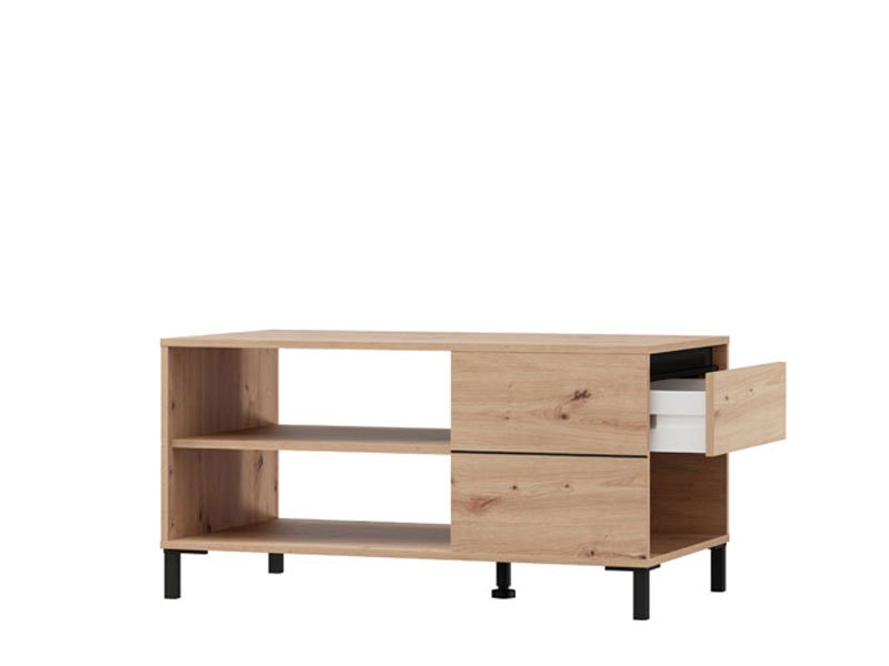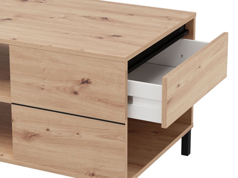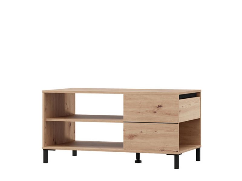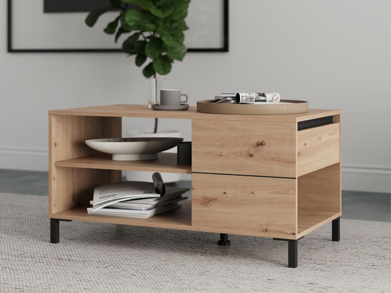 Журнальный стол MARRON, выполненный в сочетании декора ремесленного дуба и чёрной матовой фольги, привносит в пространство естественное тепло и современный визуальный контраст. Полезное пространство, помимо столешницы, включает полку-перегородку под ней, которая обеспечивает практичное и упорядоченное хранение различных предметов. Журнальный стол MARRON является частью системы элементов MARRON, отличающейся гармоничным сочетанием рустикальных тонов и функциональности современного дизайна.